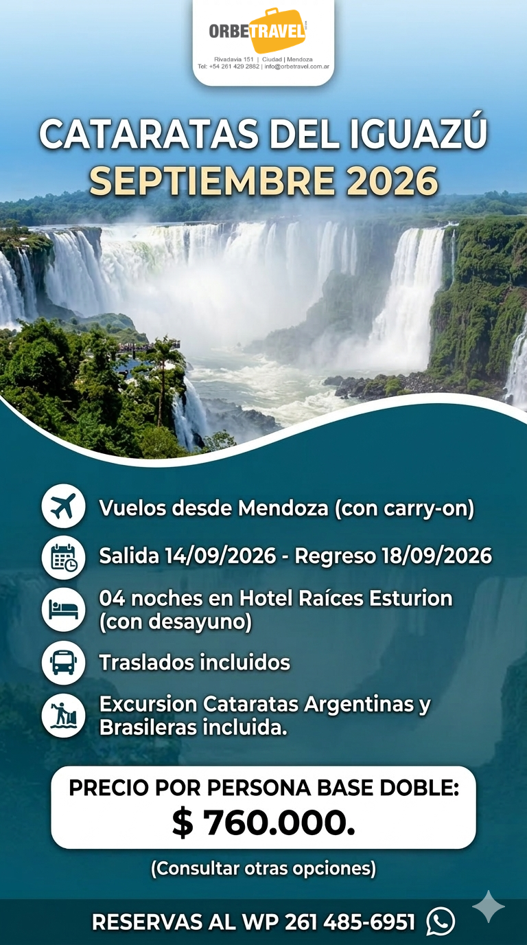 Cataratas Septiembre 2026 On 10/03/202610/03/2026 by Orbe Travel Posted in PaquetesTagged argentina, cataratas del iguazu Tu nombre - Name Tu correo electrónico - email address Paquete / Viaje de interés - Excursion / Trip Consulta / Datos pasajeros / Whatsapp - Passengers info / Inquiry / Whatsapp number Inicio
